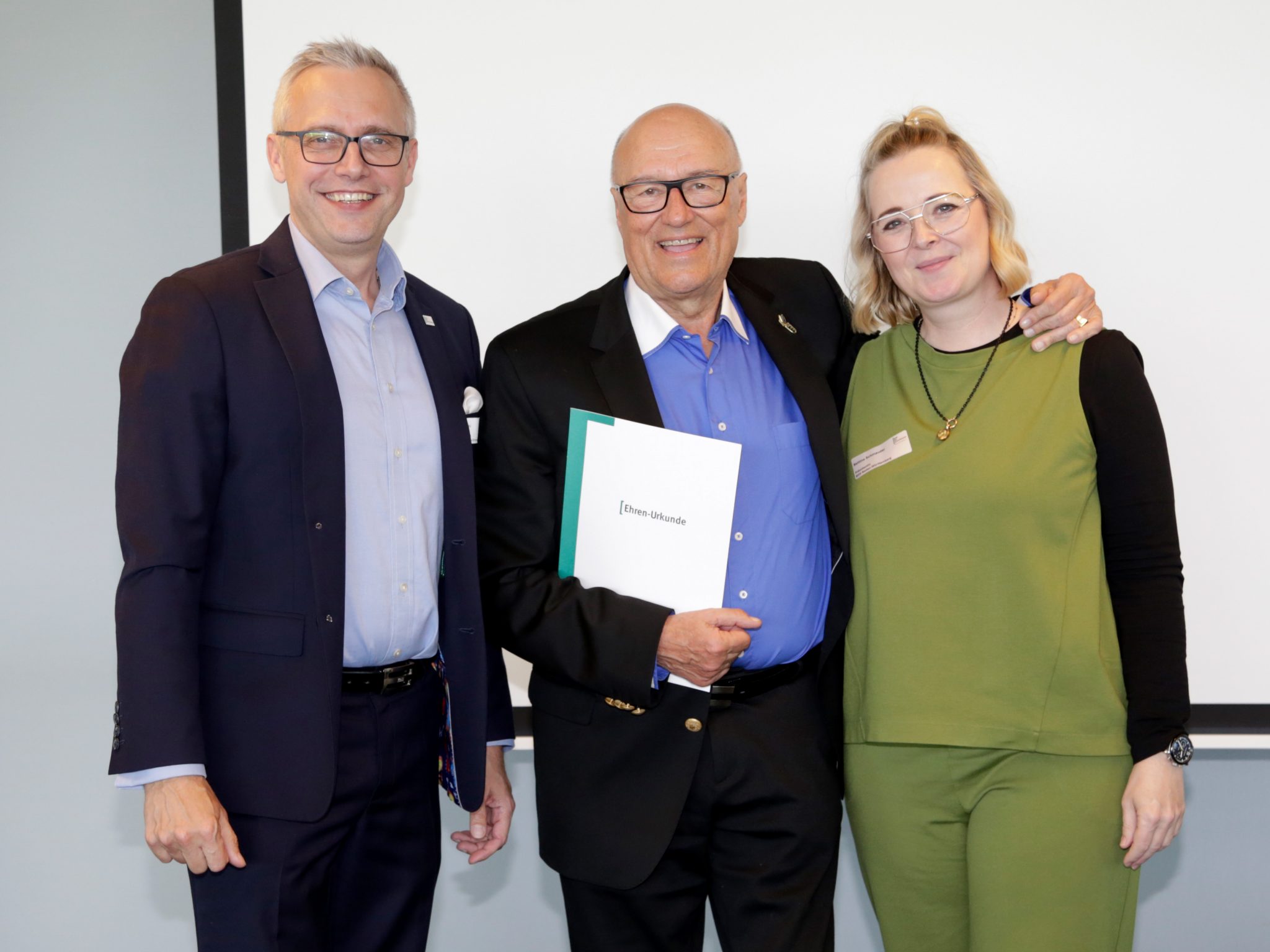Höchste Auszeichnung des BDS BW an Gerd Scheffold (Mitte), überreicht von den Präsidenten Jan Dietz (links) und Bettina Schmauder (rechts).